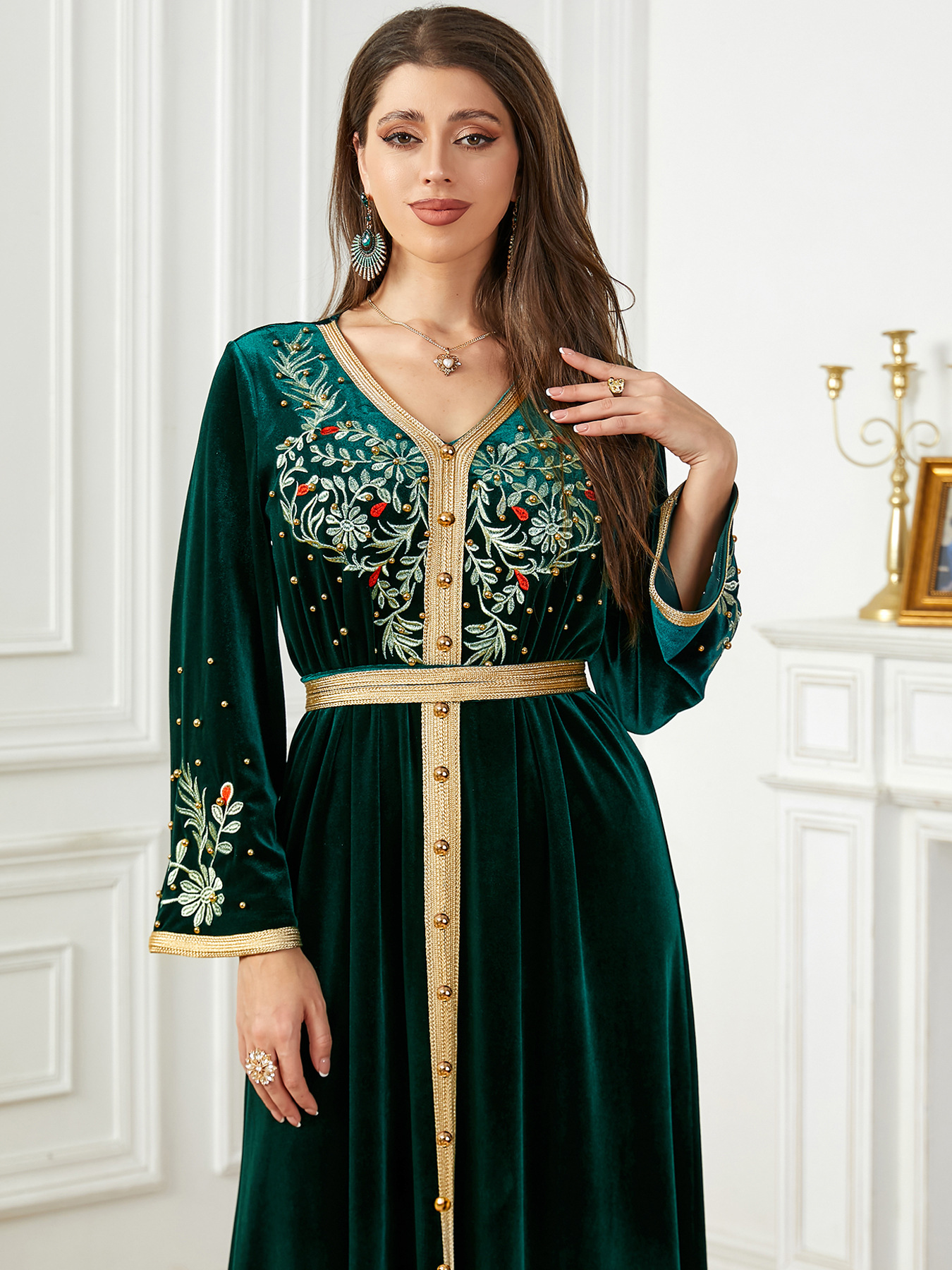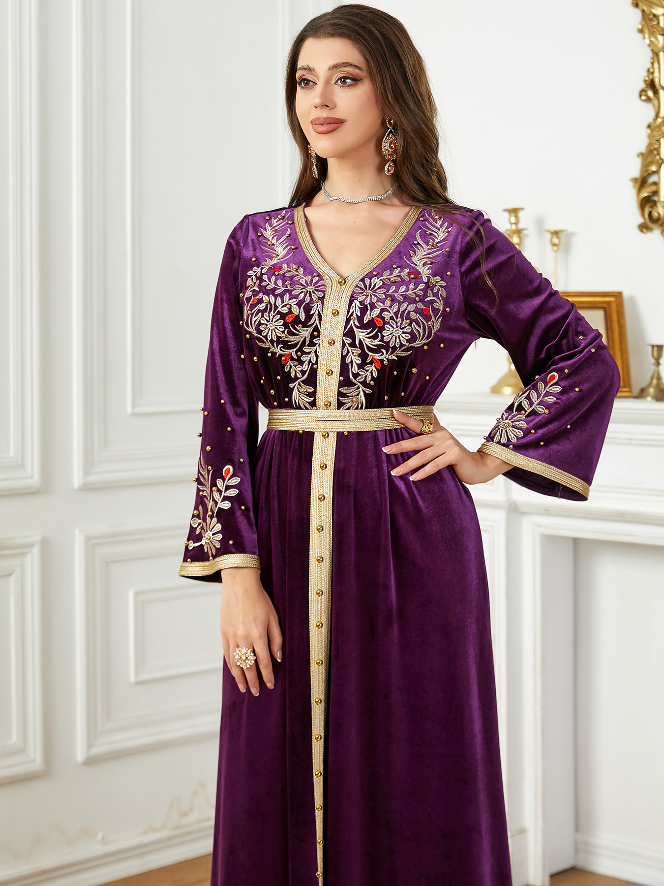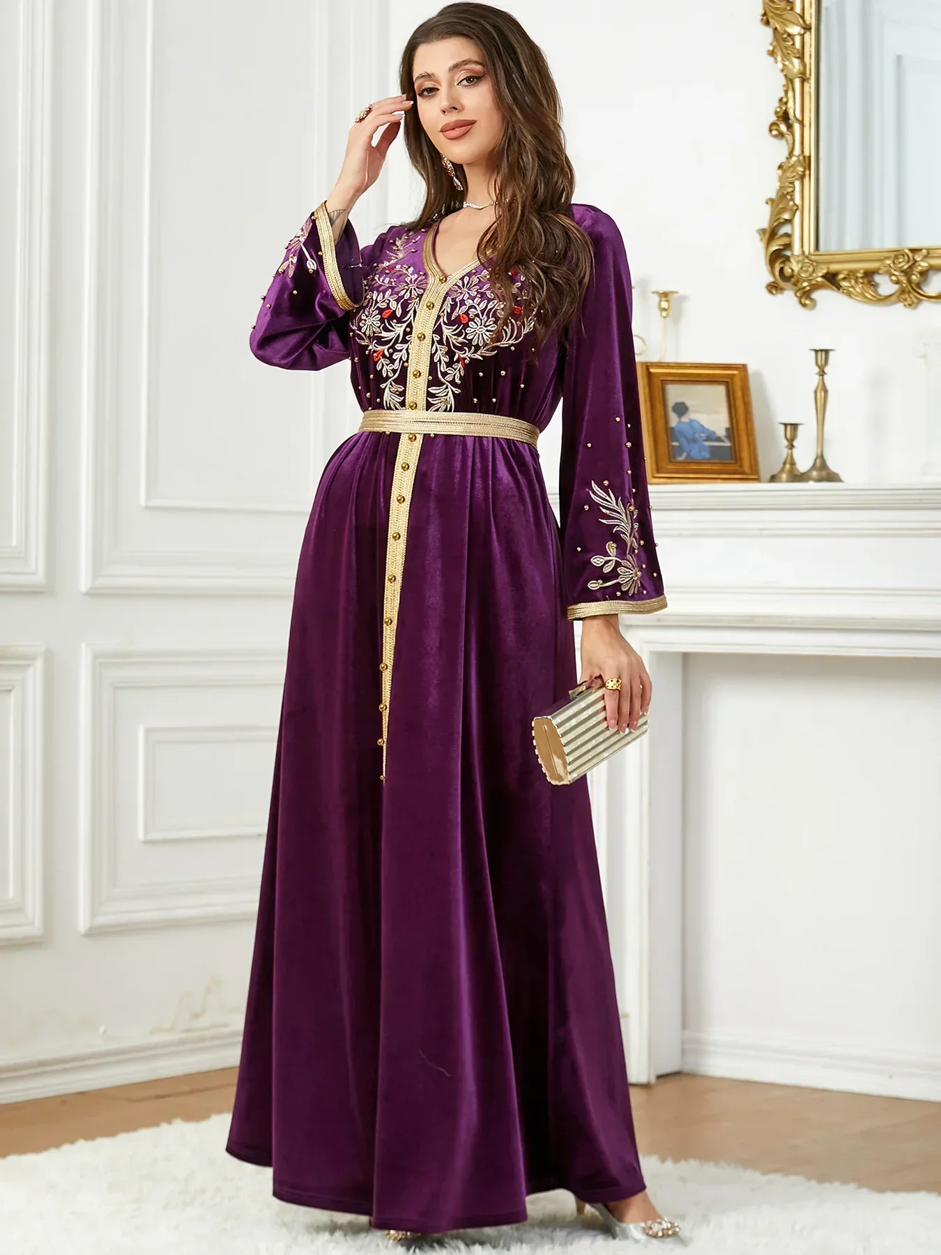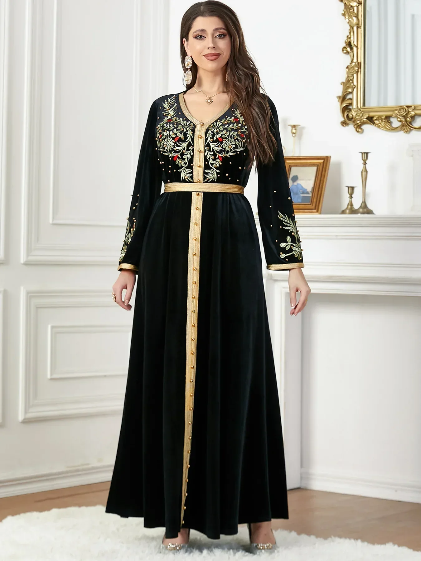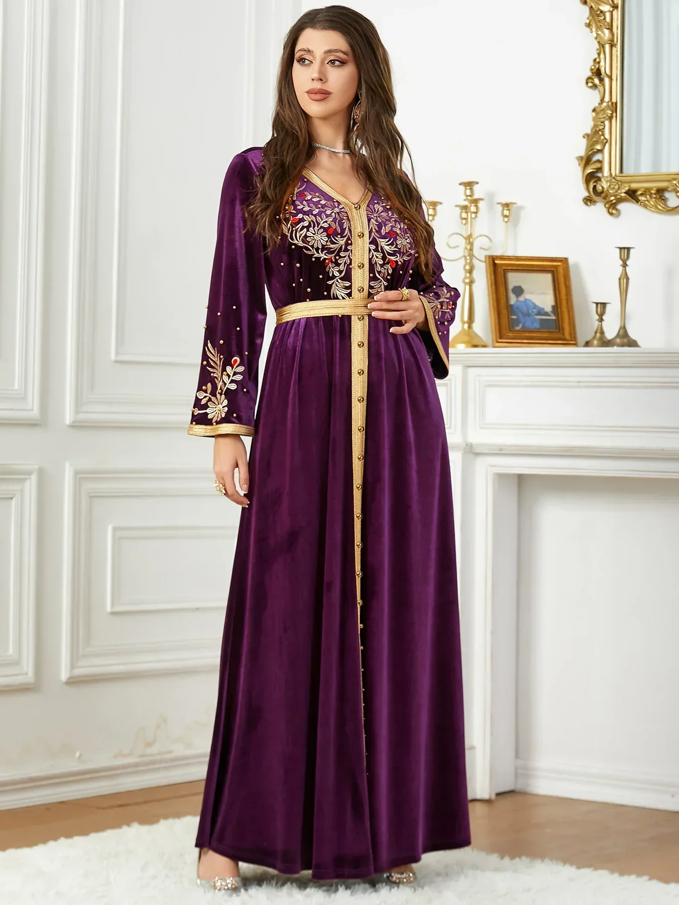 Abaya Prestige – Robe De Fête Marocaine En Velours Et Perles l’éclat du velours, la grâce des perles