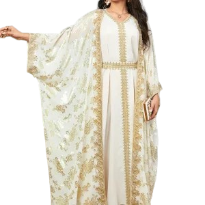 Sélectionnez la taille qui vous convient et créez votre silhouette signature avec la djellaba écrue festive brodée. Cet ajout à votre look vous permettra de faire rayonner votre élégance lors de toutes vos sorties. En toute simplicité, vous serez prête à impressionner, que ce soit lors d’un mariage ou d’une cérémonie.