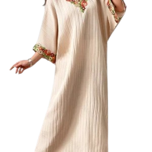 L’équilibre parfait entre tradition et modernité se retrouve dans cette pièce emblématique. Inspiré du style jalabiya élégante, ce caftan arbore des lignes épurées qui lui confèrent une élégance orientale revisitée, parfait pour affronter les journées d’automne avec style.
