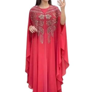 Imaginez-vous entrer dans une pièce vêtue de cette abaya batwing, l’ondulation de son tissu créant une harmonie visuelle incroyable. Les cristaux accrochent la lumière, attirant tous les regards sur vous. Cette robe orientale soirée vous donne une sensation de confiance et de grâce, un véritable hommage à votre féminité.
