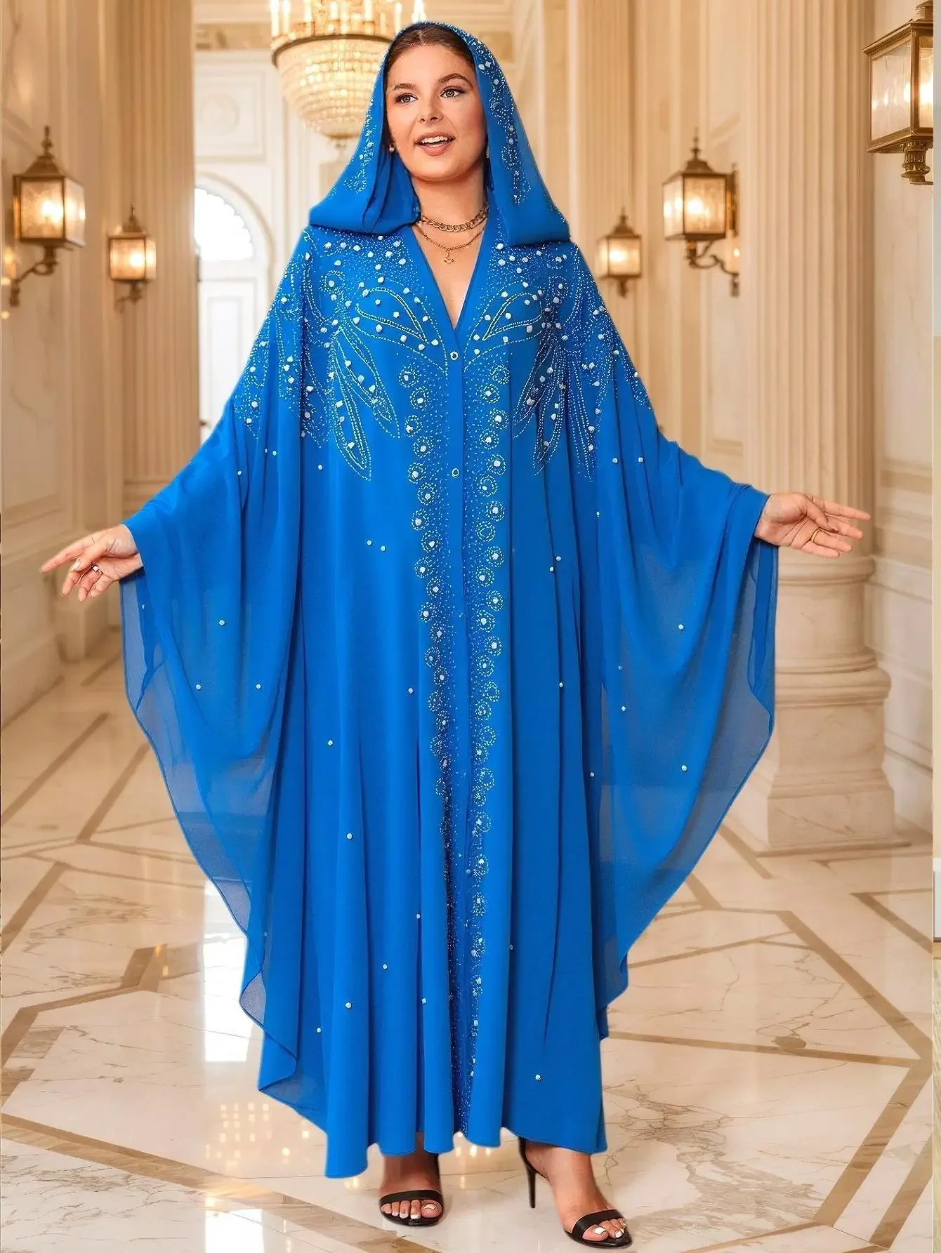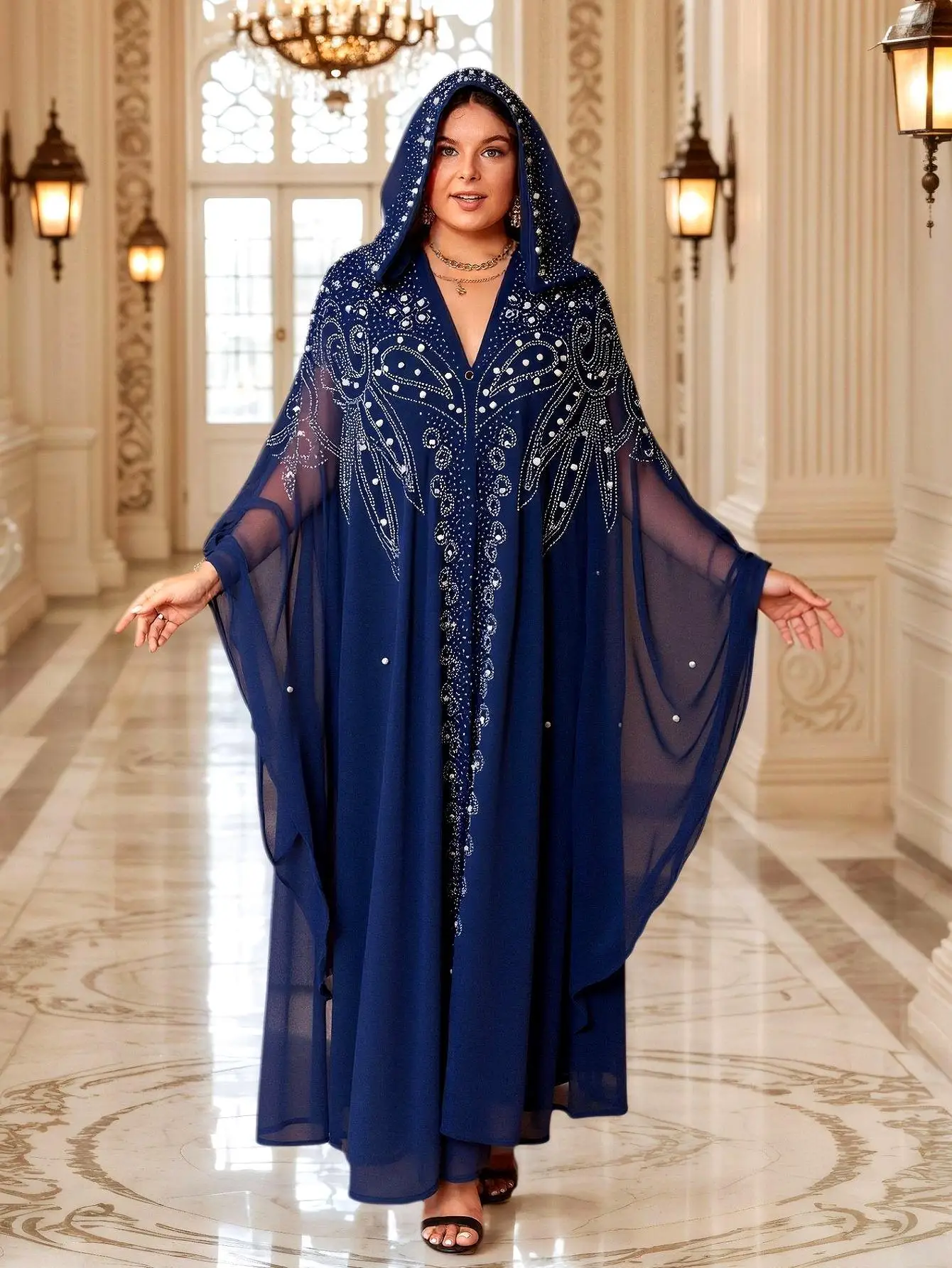 En portant cette robe orientale élégante, vous franchissez le seuil de chaque événement avec une sérénité royale. Les regards se tournent vers vous, captivés par les ornements qui scintillent à la lumière, vous transformant en véritable icône de style.