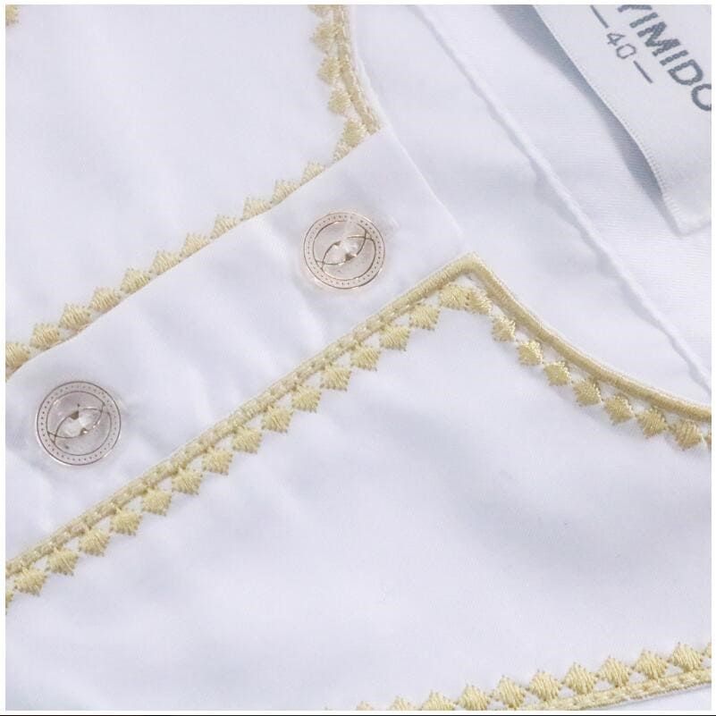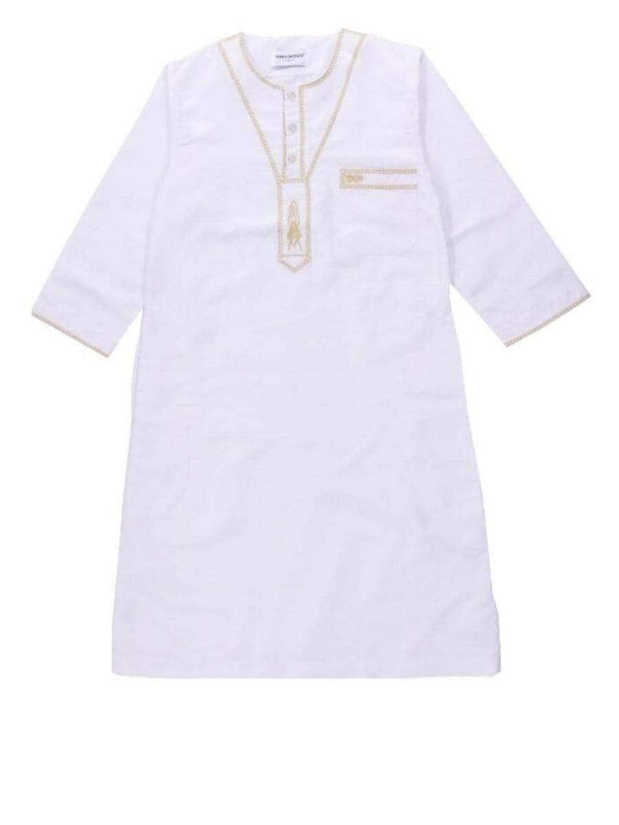 La djellaba garçon Naïm se distingue par son contraste entre le blanc immaculé et les broderies dorées raffinées, offrant une allure chic parfaite pour les fêtes et autres grands moments. Cette tenue orientale garçon attire tous les regards et se prête à toutes les occasions.