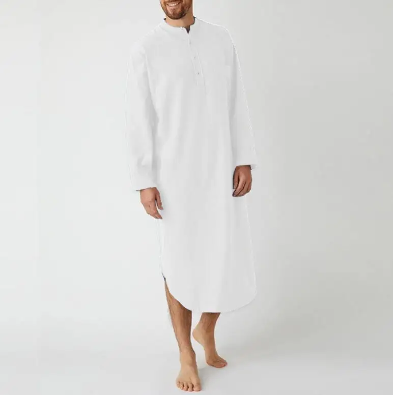 Le col mandarin, également appelé col mao, et le bouton unique apportent une touche de sophistication à cette pièce. Ce thobe homme élégant structure la silhouette avec finesse et assure un port raffiné, quel que soit l’occasion.