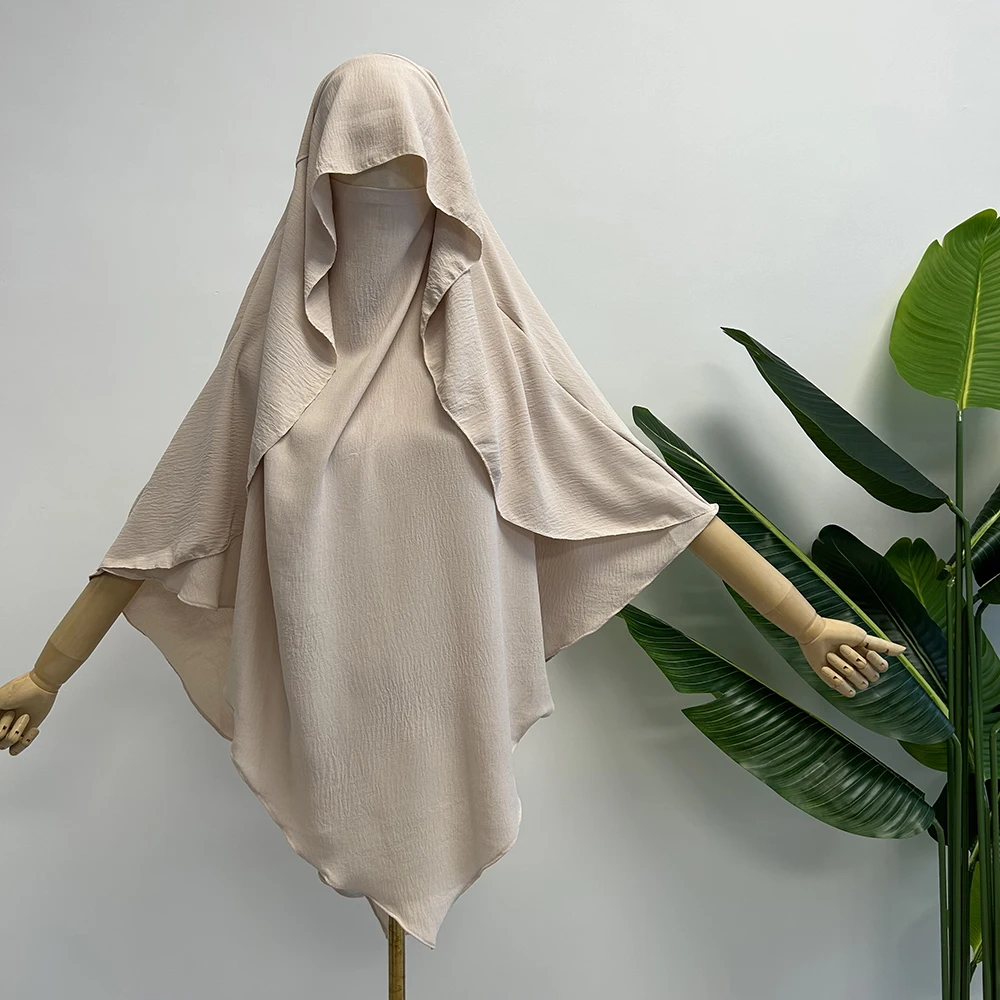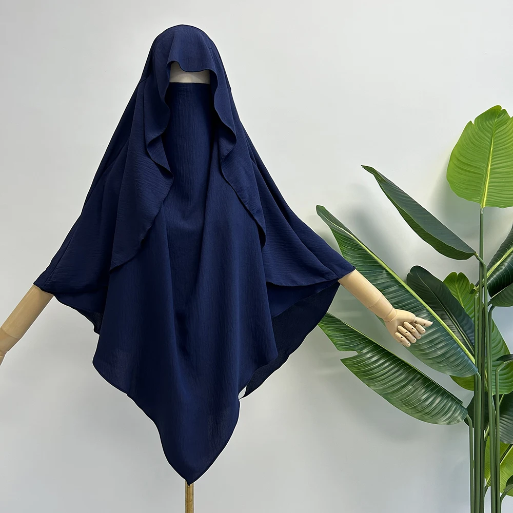 Le crêpe Jazz, utilisé dans la confection de ce khimar en crêpe Jazz, offre une texture douce et un léger stretch qui facilite le mouvement. Sa résistance au froissage et sa facilité d’entretien en font la solution idéale pour le quotidien. Profitez d’un voile long opaque qui vous assure une couvrance parfaite pendant vos journées de Ramadan.